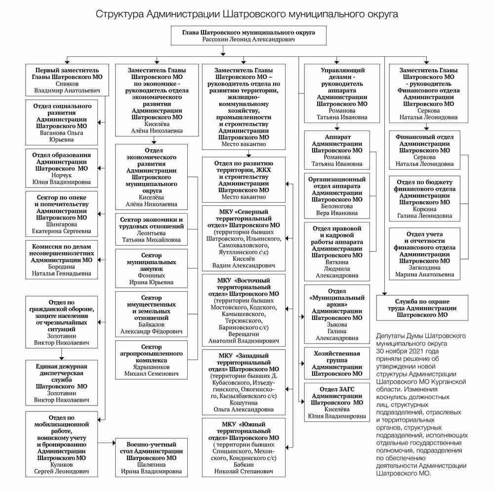 Депутаты Думы Шатровского муниципального округа 30 ноября 2021 года приняли решение об утверждении новой структуры Администрации Шатровского МО Курганской области. Изменения коснулись должностных лиц, структурных подразделений, отраслевых и территориальных органов, структурных подразделений, исполняющих отдельные государственные полномочия, подразделения по обеспечению деятельности Администрации Шатровского МО.