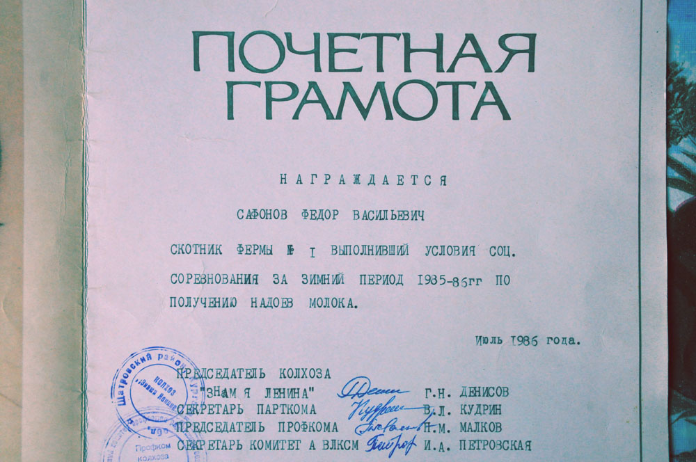 «Только вот забыли составители недавно вышедшей книги к 60-летию колхоза «Знамя Ленина» труд и старания моего мужа», - сетует супруга ветерана Галина Петровна Сафонова. – Даже фамилии его нигде не упомянули. Обидно. Ведь перестал он работать всего 3 года назад, и то по состоянию здоровья».