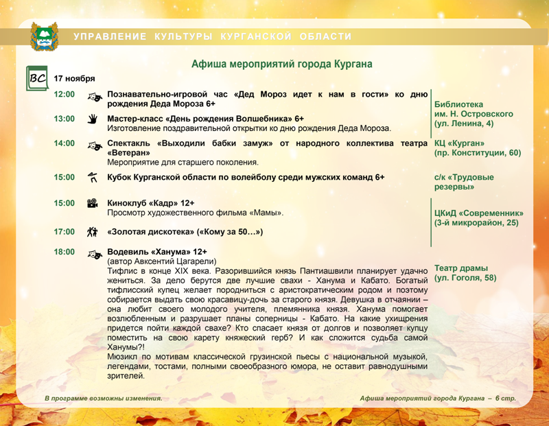 Афиша мероприятий на открытых площадках Кургана на 17 ноября 2019 года