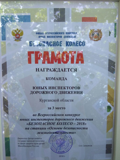 Курганскую область на этих соревнованиях представляла команда ЮИД Каргапольского района Журавлевской средней общеобразовательной школы, победители областного конкурса. Жилин Данил, Карлышев Николай, Курносенко Эмилия и Мезенцева Полина в течение четырех дней боролись за звание лучшей команды России.
