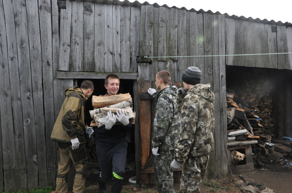Сергей Дьячков, Вадим Женгура, Дмитрий Маслов, Сергей Неустроев, Иван Шимолин, Алексей Ядрышников) и пять девятиклассников (Владимир Березин, Даниил Загвоздин, Александр Ковков, Александр Бахматов, Александр Кочегин) вместе с Александром Александровичем Киселёвым и работником Шатровского лесничества Алексеем Сергеевичем Грошевым приехали к пожилым людям.