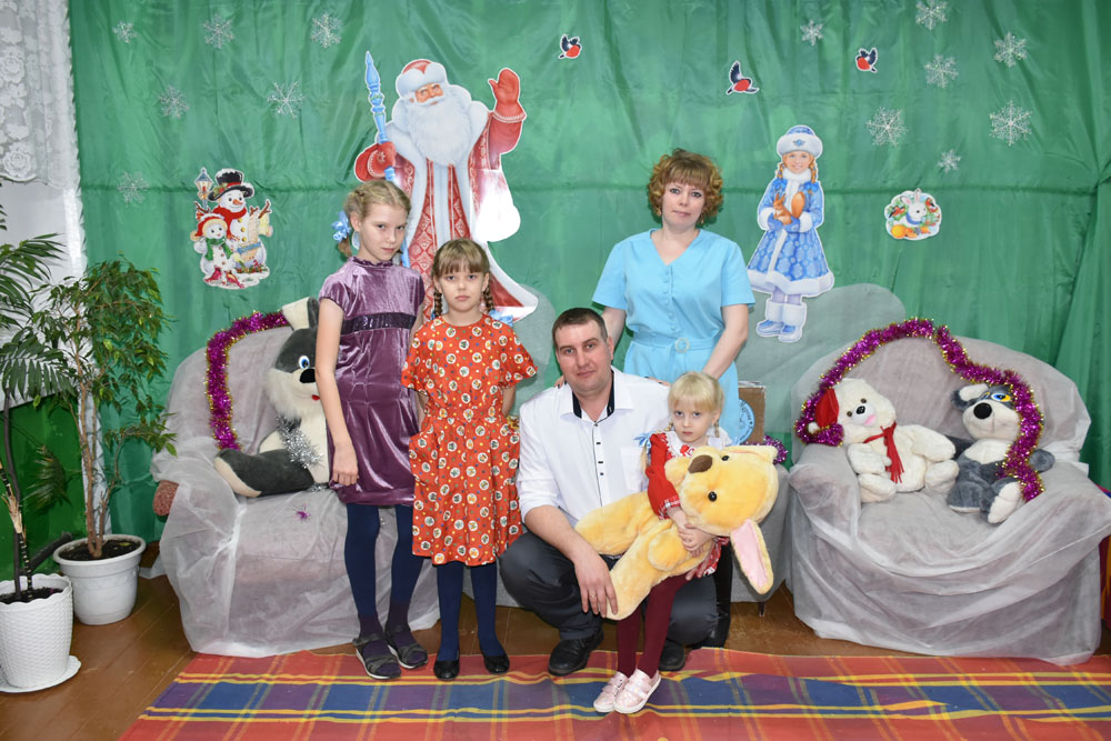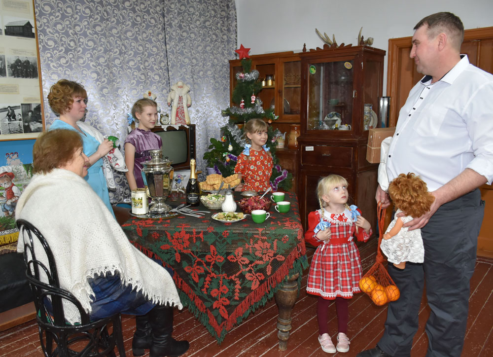 В прошлом веке мы «очутились» вместе с семьёй Кузнецовых из Спицыно. Думаем, Андрею и Светлане, родившимся тоже во времена Советского Союза, наша импровизированная фотосессия понравилась. Необычно и весело было и их трём дочкам. Ксюша, Наташа и маленькая Настя смотрелись очень трогательно среди музейных экспонатов. Бантики, косички, нарядная ёлка с игрушками – всё как в нашем детстве. Кстати, Андрей и Светлана — не только трудолюбивые (Андрей работает в хозяйстве Александра Грехова, а Светлана – продавец в сельском магазине), но и творческие люди. В этом году им доверили роль Деда Мороза и Снегурочки в местном детском саду. Мы спросили у девочек, за что они любят Новый год.