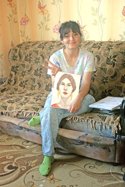 А как здорово она рисует! Особенно девушке удаются портреты, оригинальные и интересные. Пожелаем нашей симпатичной выпускнице сделать правильный в жизни выбор. Кстати, девушки, женщины в Таджикистане очень красивые. У них глаза по форме и по цвету необычные. Платье и штаны – вот их национальный наряд.