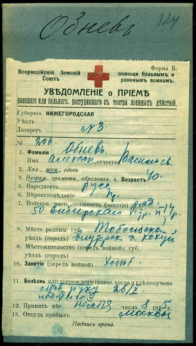 ОГНЕВ Александр Васильевич, 40 лет, женатый, православный, неграмотный, перед войной занимался хлебопашеством. Место рождения: Тобольская губ., Елуторск (Ялуторовский) уезд, д. Кокуй. 26.10.1915 года под г. Рига ранен в левую руку. Воинская часть: 50-й Сибирский стрелковый полк, 14 рота, рядовой. 08.11.1915 года из Москвы принят в Нижегородский лазарет №3.