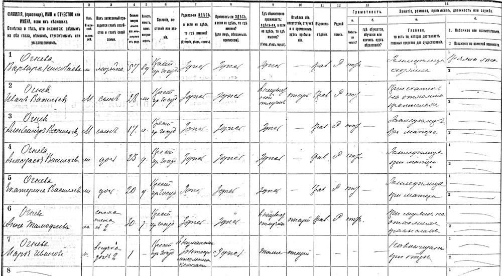 В Переписных листах Первой Всеобщей переписи населения Российской империи 1897 г. по Тобольской губернии д. Кокуй указано, что в доме Варвары Николаевны Огнёвой, 57-и лет проживают её дочери Анастасия Васильевна, 23-х лет, Екатерина Васильевна, 20-и лет, сыновья Александр Васильевич, 17-и лет, Иван Васильевич, 28-и лет, с женой Анной Тимофеевной, 30-и лет и их дочерью Мартой Ивановной, которой исполнился только год. Были православные, неграмотные. Сведений об отце Александра Васильевича мы не нашли.